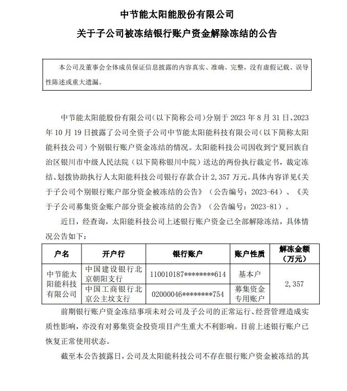 近日,经查询,太阳能科技公司上述银行账户资金已全部解除冻结。